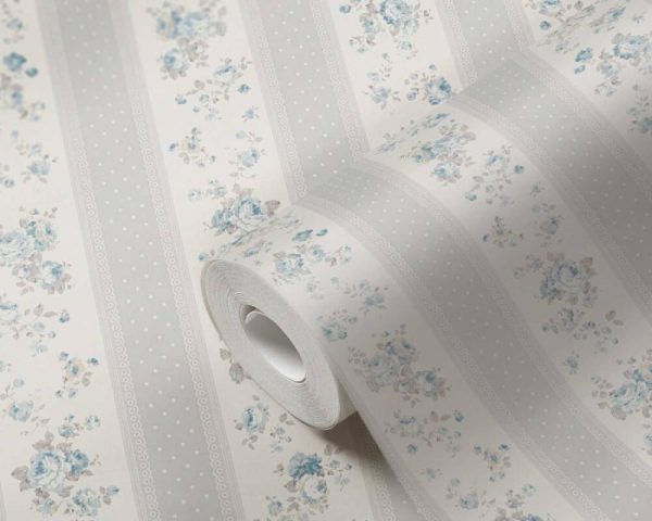 Medidas: 10,05 m x 0,53 m. Case: Sin case. Calidad: Tejido no tejido. Estilo: Papel pintado rayas con diseño floral y topitos en color gris, azul y crema. Acabado vinílico.