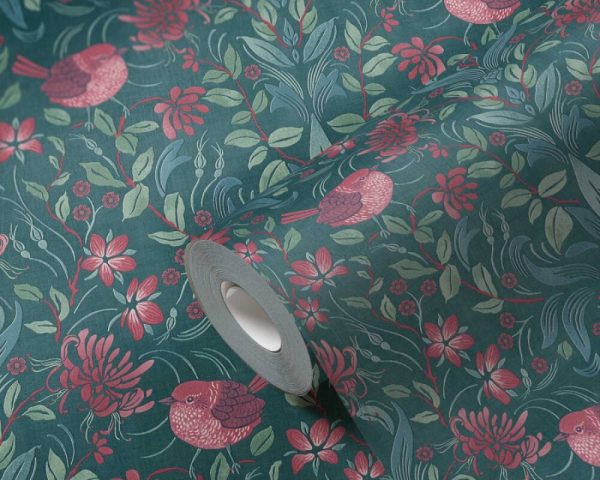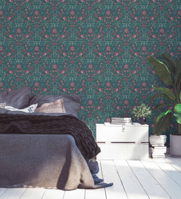 Medidas: 10,05 m x 0,53 m. Case: 53 cm (straight match). Calidad: Tejido no tejido. Estilo: Papel pintado floral en color rojo, verde sobre fondo turquesa. Acabado vinílico.