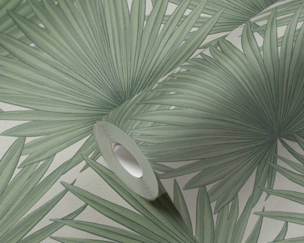 Medidas: 10,05 m x 0,53 m. Case: 53 / 26 cm (offset match). Calidad: Tejido no tejido. Estilo: Papel pintado palmeras color verde con fondo en beige. Acabado vinílico.