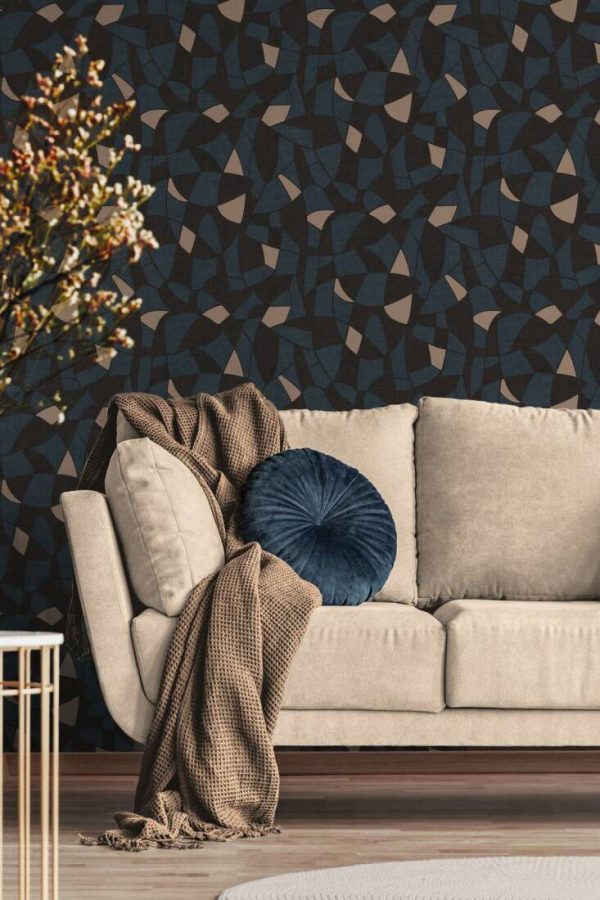 Medidas: 10,05 m x 0,53 m. Case: 64 / 32 (offset match). Calidad: Tejido no tejido. Estilo: Papel pintado gráfico diseño geométrico en color beige, azul y negro. Acabado vinílico.