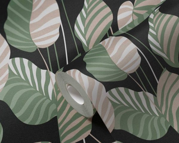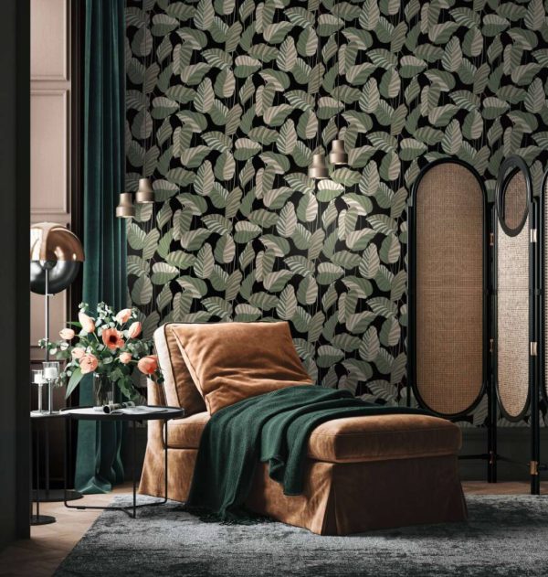Medidas: 10,05 m x 0,53 m. Case: 53 / 26 cm (offset match). Calidad: Tejido no tejido. Estilo: Papel pintado hojas color verde y beige sobre fondo negro. Acabado vinílico.
