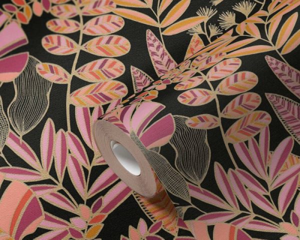 Medidas: 10,05 m x 0,53 m. Case: 53 / 26 cm (offset match). Calidad: Tejido no tejido. Estilo: Papel pintado floral en color rosa, salmón y coral sobre fondo negro con destellos dorados. Acabado vinílico.