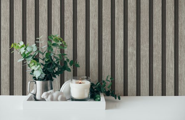 Medidas: 10,05 m x 0,53 m. Case: Sin case. Calidad: Tejido no tejido. Estilo: Papel pintado efecto listones de madera natural en color gris.