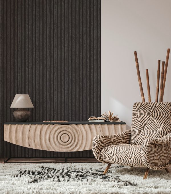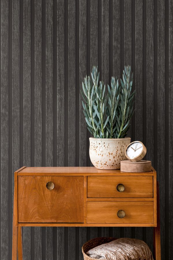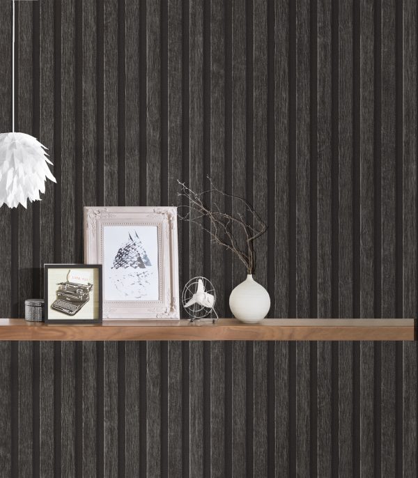 Medidas: 10,05 m x 0,53 m. Case: Sin case. Calidad: Tejido no tejido. Estilo: Papel pintado efecto listones de madera natural en color negro.