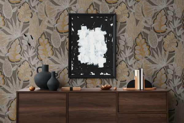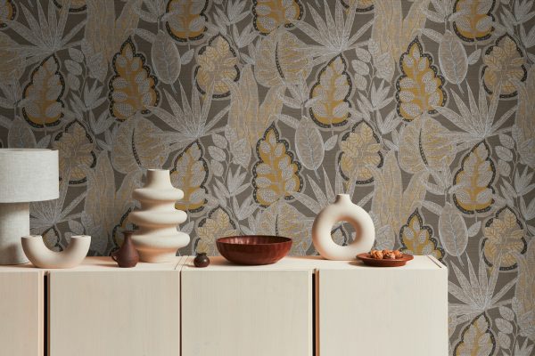 Medidas: 10,05 m x 0,53 m. Case: 64/32 cm (offset match). Calidad: Tejido no tejido. Estilo: Papel pintado hojas. Estilo Floral. En color marrón, verde caqui y amarillo.