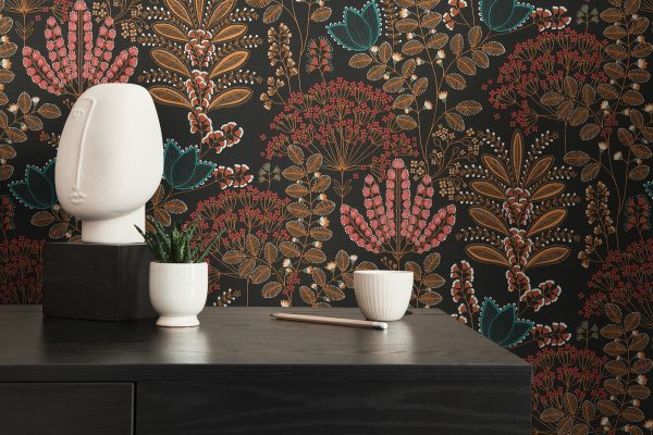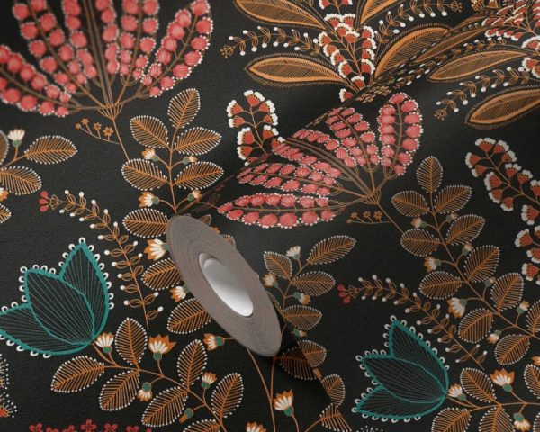 Medidas: 10,05 m x 0,53 m. Case: 53/26 cm (offset match). Calidad: Tejido no tejido. Estilo: Papel pintado hojas. Estilo Floral. En color negro, rojo, naranja y turquesa.
