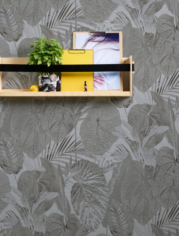 Medidas: 10,05 m x 0,53 m. Case: 64/32 cm (offset match). Calidad: Tejido no tejido. Estilo: Papel pintado hojas. Estilo Floral. En color gris plateado.