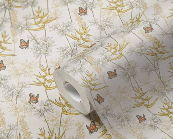 Medidas: 10,05 m x 0,53 m. Case: 53/0 cm (case recto). Calidad: Tejido no tejido. Estilo: Papel pintado plantas y mariposas. Estilo Floral. En color blanco, amarillo y naranja.