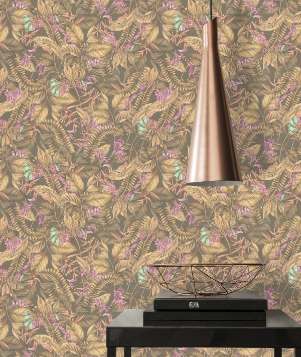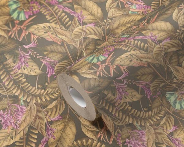 Medidas: 10,05 m x 0,53 m. Case: 53/0 cm (case recto). Calidad: Tejido no tejido. Estilo: Papel pintado hojas. Estilo Floral. En color marrón, púrpura y amarillo.