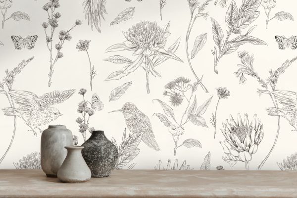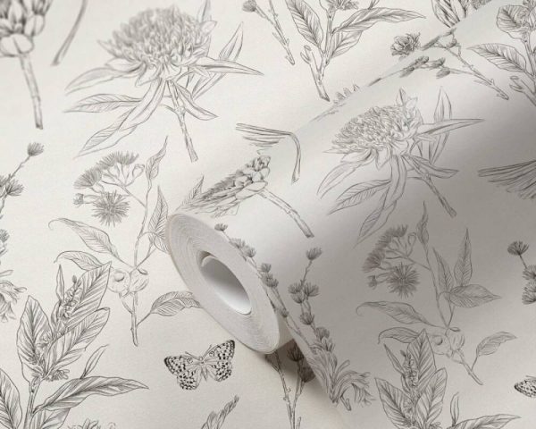 Medidas: 10,05 m x 0,53 m. Case: 53/0 cm (case recto). Calidad: Tejido no tejido. Estilo: Papel pintado plantas con pájaros. Estilo Floral. En color blanco y negro.