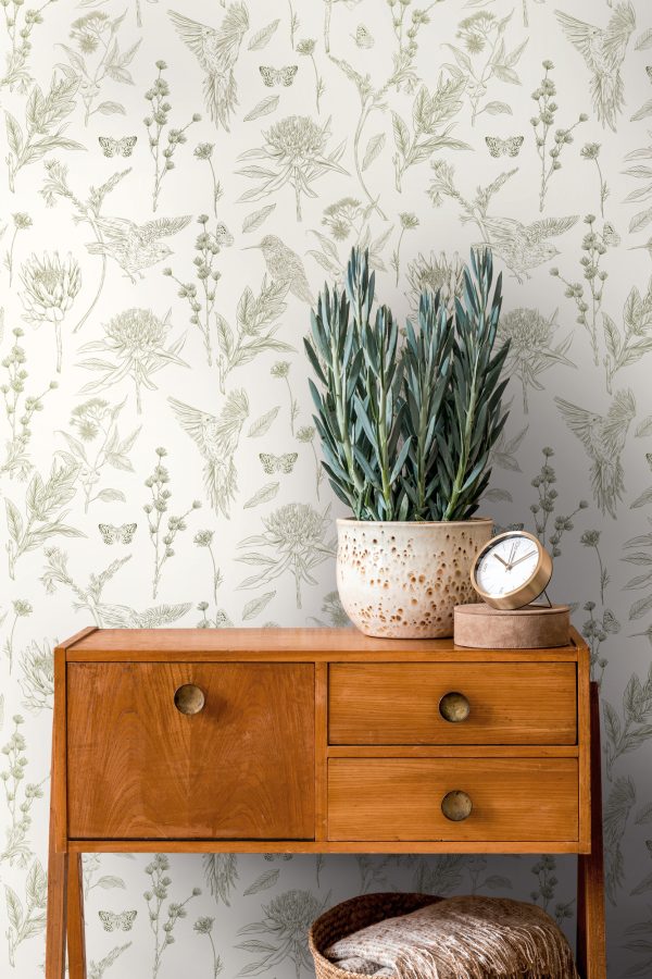 Medidas: 10,05 m x 0,53 m. Case: 53/0 cm (case recto). Calidad: Tejido no tejido. Estilo: Papel pintado plantas con pájaros. Estilo Floral. En color crema y verde.