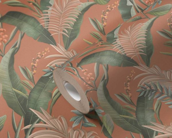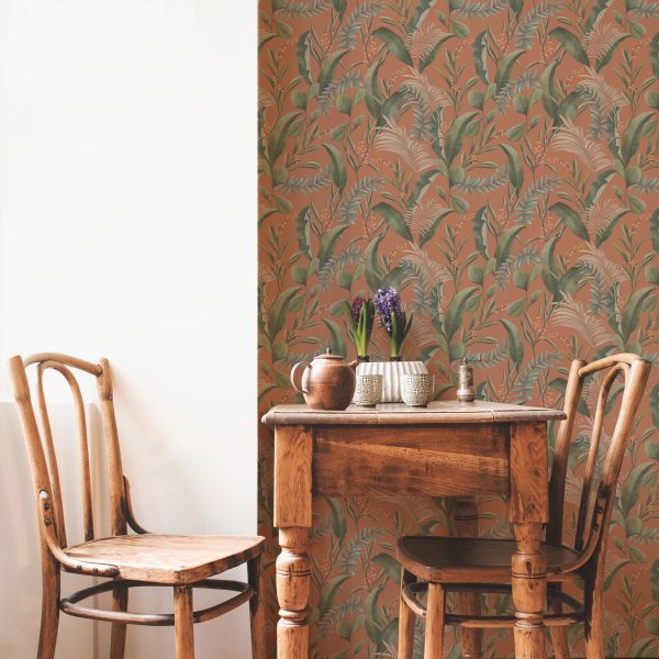 Medidas: 10,05 m x 0,53 m. Case: 53/0 cm (case recto). Calidad: Tejido no tejido. Estilo: Papel pintado hojas. Estilo Floral. En color naranja teja y verde.