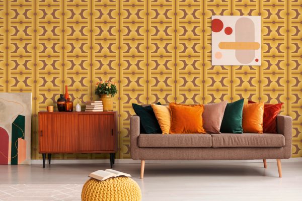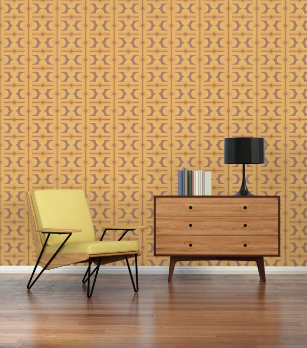 Medidas: 8,50 m x 0,53 m. Case: 16/0 cm (case recto). Calidad: tejido no tejido. Estilo: Papel pintado geométrico en color marrón y amarillo.