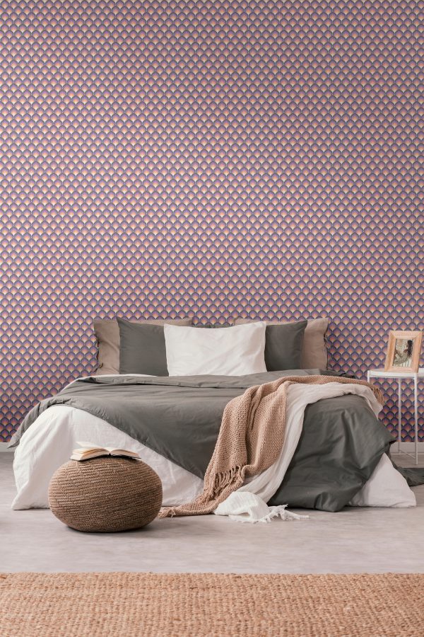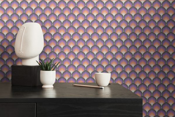 Medidas: 8,50 m x 0,53 m. Case: 8/0 cm (case recto). Calidad: tejido no tejido. Estilo: Papel pintado geométrico en color negro, naranja y lila/púrpura.