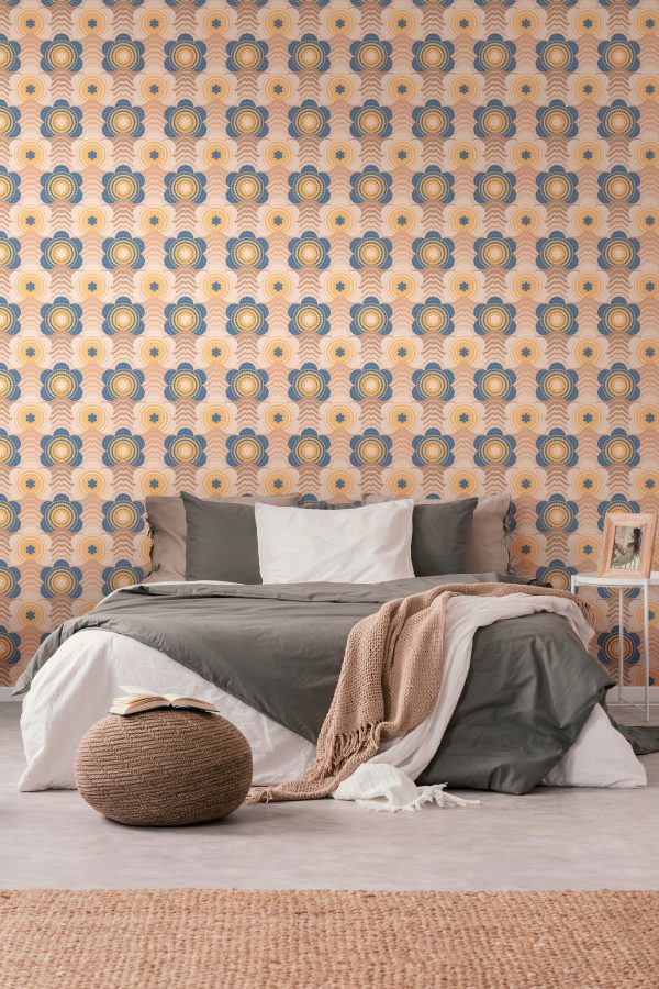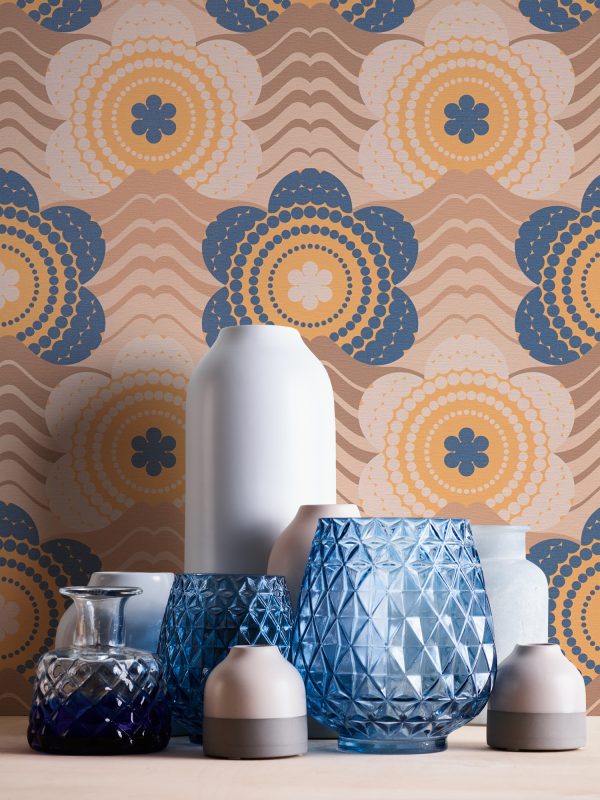 Medidas: 8,50 m x 0,53 m. Case: 28/0 cm (case recto). Calidad: tejido no tejido. Estilo: Papel pintado flores en color marrón, azul y beige.
