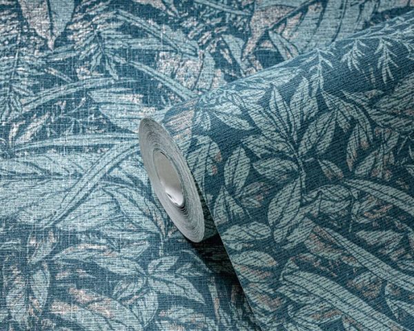 Medidas: 10,05 m x 0,53 m. Case: 64/32 cm (offset match). Calidad: tejido no tejido. Estilo: Papel pintado hojas. Estilo floral. En color azul turquesa metalizado.