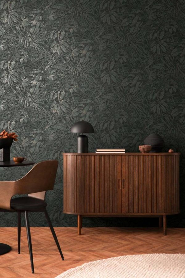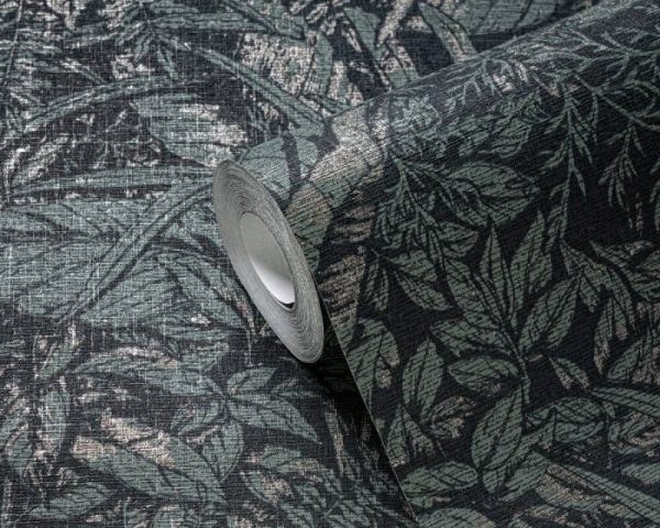 Medidas: 10,05 m x 0,53 m. Case: 64/32 cm (offset match). Calidad: tejido no tejido. Estilo: Papel pintado hojas de estilo floral en color negro, azul y verde con detales metalizados.