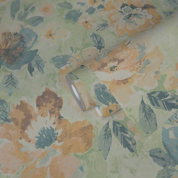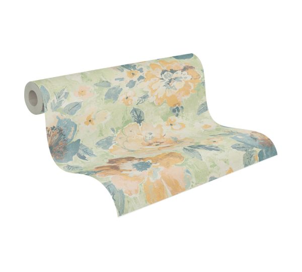 Medidas: 10,05 m x 0,53 m. Case: 64 / 32 cm (offset match). Calidad: Tejido no tejido. Estilo: Papel pintado con motivos florales de estilo vintage en acuarela de color amarillo, azul y verde.