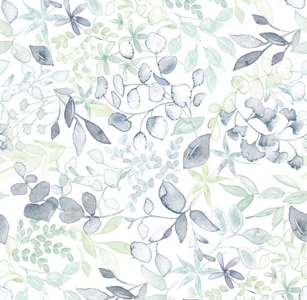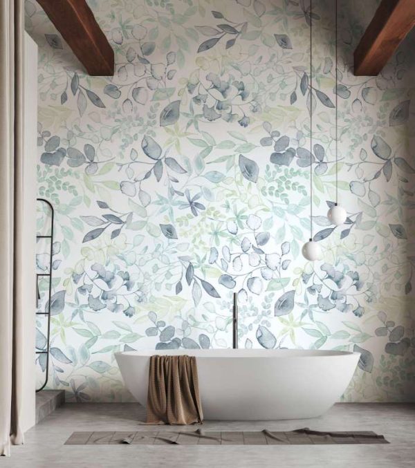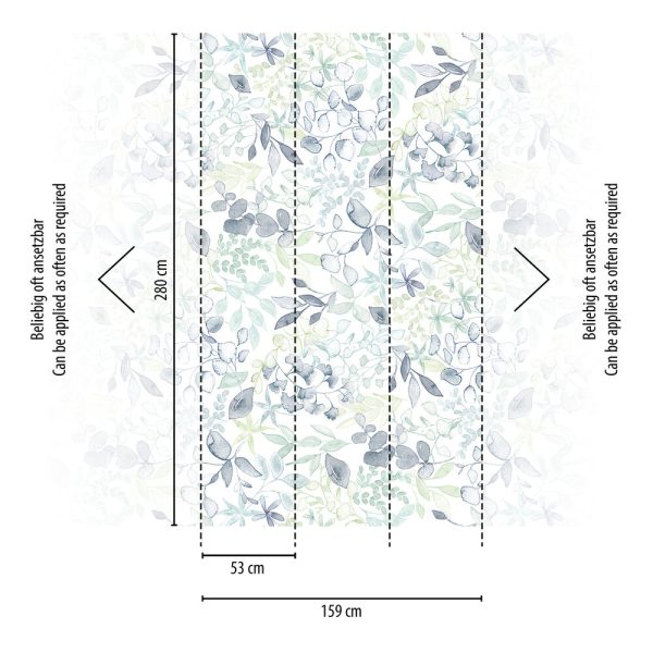 Medidas: 1,59 m x 2,80 m. (3 tiras 0,53 m x 2,80 m) Case: Sin case. Calidad: Tejido no tejido. Estilo: Mural de impresión digital con diseño de hojarasca de estilo acuarela en color azul y fondo blanco.
