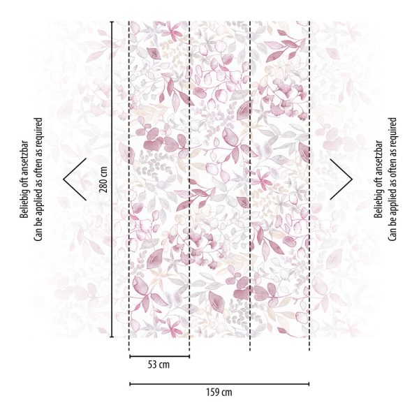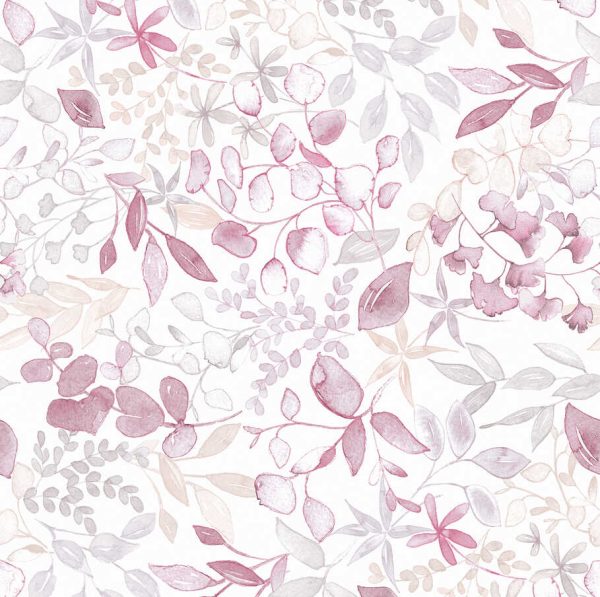 Medidas: 1,59 m x 2,80 m. (3 tiras 0,53 m x 2,80 m) Case: Sin case. Calidad: Tejido no tejido. Estilo: Mural de impresión digital con diseño de hojarasca de estilo acuarela en color rosa y fondo blanco.