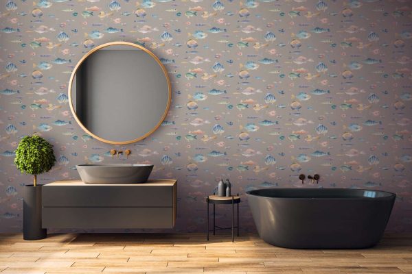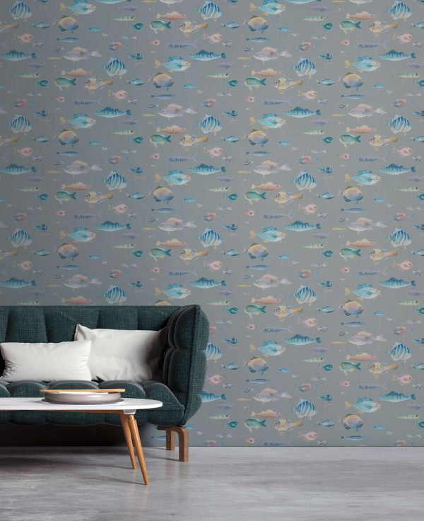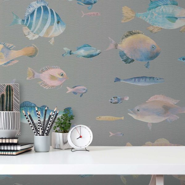 Medidas: 10,05 m x 0,53 m. Case:64/32 cm (offset match-case salteado). Calidad: tejido no tejido. Estilo: Papel pintado diseño marino con peces de colores sobre fondo gris.