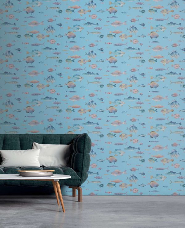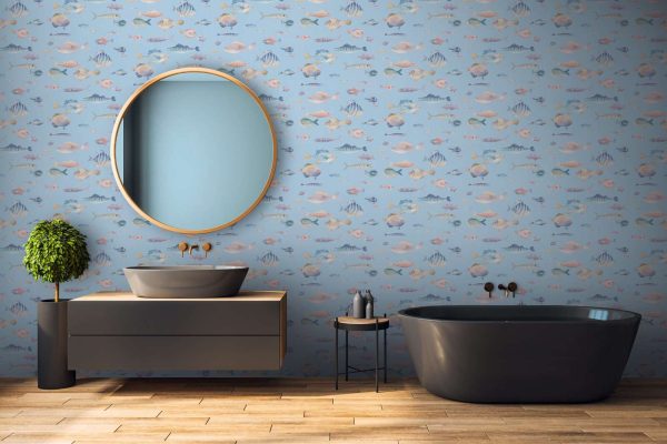 Medidas: 10,05 m x 0,53 m. Case:64/32 cm (offset match-case salteado). Calidad: tejido no tejido. Estilo: Papel pintado diseño marino con peces de colores sobre fondo azul.