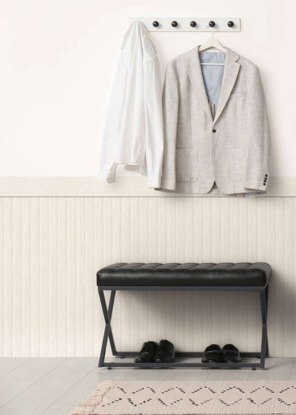Medidas: 1,06 m x 5,00 m. Case: sin case. Calidad: Tejido no tejido. Estilo: Panel zócalo efecto lamas de madera en color blanco.