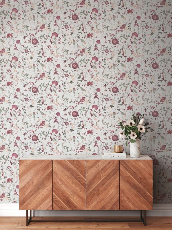 Medidas: 10,05 m x 0,53 m. Case: 64/ 32 cm (offset match/ case salteado). Calidad: tejido no tejido. Estilo: Papel pintado diseño floral estilo vintage en colores blanco, violeta y rosa.