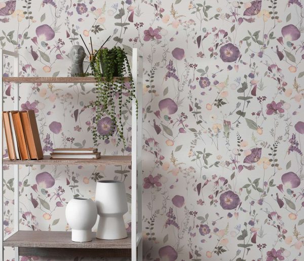Medidas: 10,05 m x 0,53 m. Case: 64/ 32 cm (offset match/ case salteado). Calidad: tejido no tejido. Estilo: Papel pintado diseño floral estilo vintage en colores violeta, verde y amarillo.