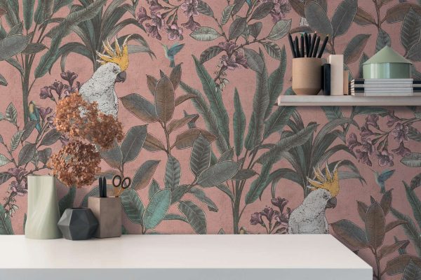 Medidas: 10,05 m x 0,53 m. Case: 64/ 32 cm (offset match/ case salteado). Calidad: tejido no tejido. Estilo: Papel pintado diseño tropical de hojarasca verde y cacatúas sobre fondo rosa salmón.