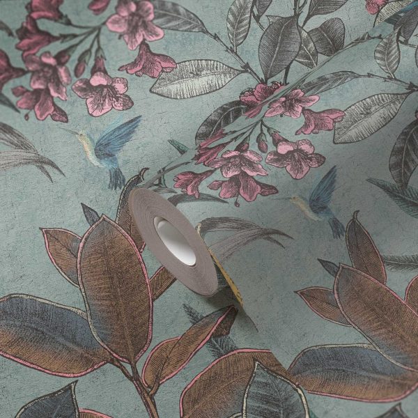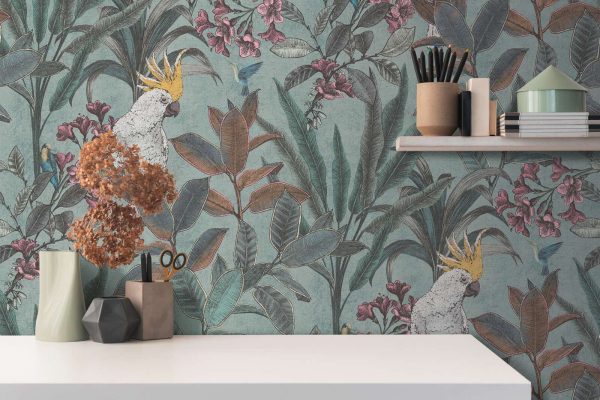 Medidas: 10,05 m x 0,53 m. Case: 64/ 32 cm (offset match/ case salteado). Calidad: tejido no tejido. Estilo: Papel pintado diseño tropical de hojarasca y flores rosas con cacatúas sobre fondo verde.