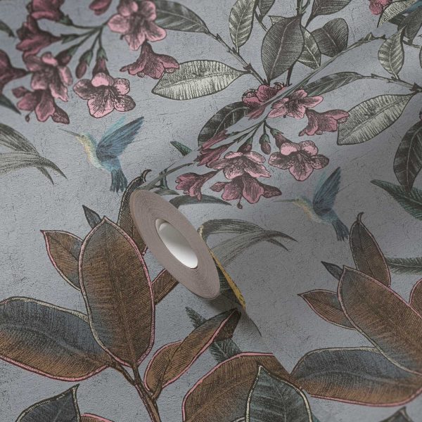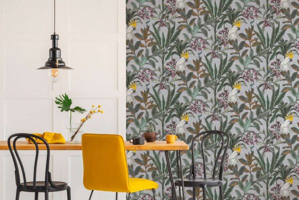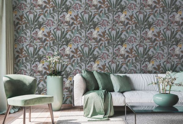 Medidas: 10,05 m x 0,53 m. Case: 64/ 32 cm (offset match/ case salteado). Calidad: tejido no tejido. Estilo: Papel pintado diseño tropical de hojarasca color verde con cacatúas sobre fondo gris.