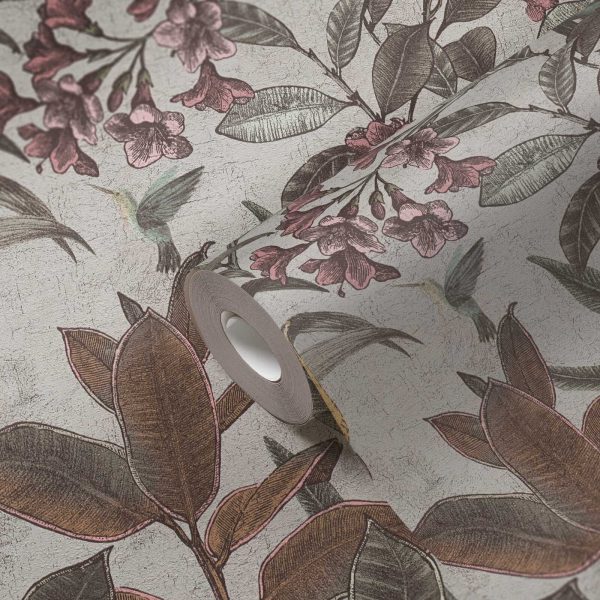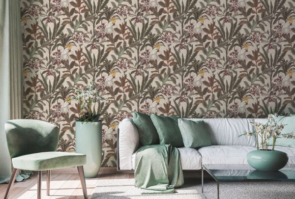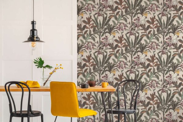 Medidas: 10,05 m x 0,53 m. Case: 64/ 32 cm (offset match/ case salteado). Calidad: tejido no tejido. Estilo: Papel pintado diseño tropical de hojarasca color verde y marrón con cacatúas sobre fondo beige.