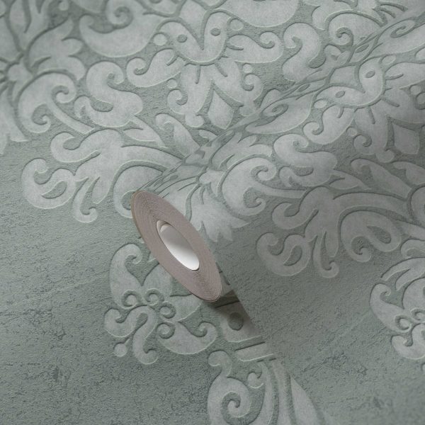 Medidas: 10,05 m x 0,53 m. Case: 64 cm (case recto). Calidad: tejido no tejido. Estilo: Papel pintado diseño ornamental estilo barroco en color verde con detalles metalizados.