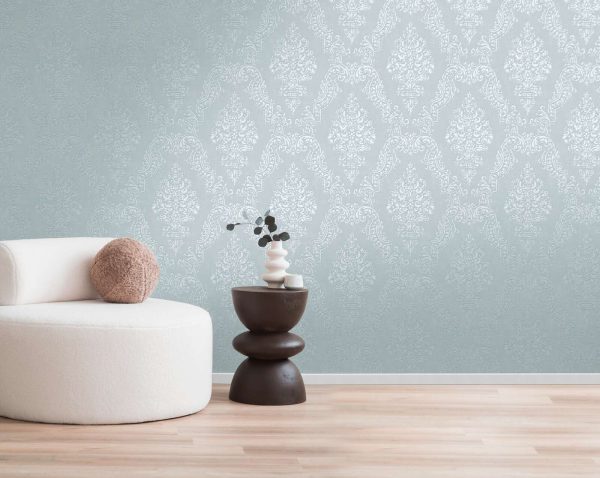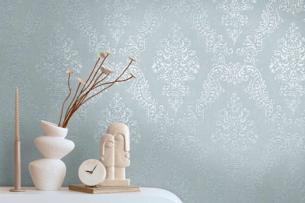 Medidas: 10,05 m x 0,53 m. Case: 64 cm (case recto). Calidad: tejido no tejido. Estilo: Papel pintado diseño ornamental estilo barroco en color verde agua-marina con detalles metalizados.