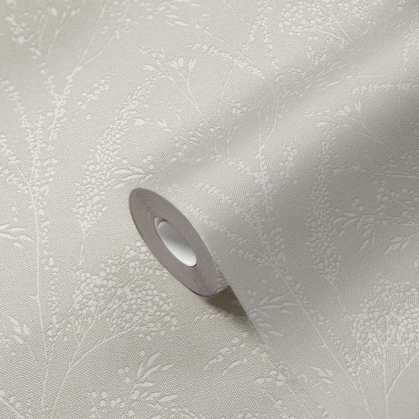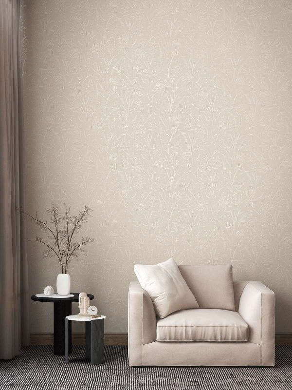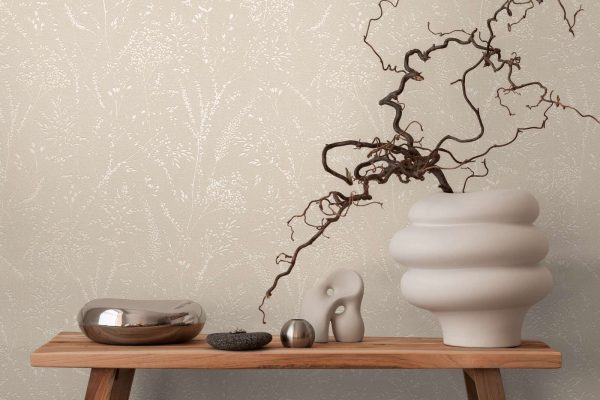 Medidas: 10,05 m x 0,53 m. Case: 64 / 32 cm (offset match/ case salteado). Calidad: tejido no tejido. Estilo: Papel pintado diseño de ramilletes/ zarcillos en color beige ligeramente metalizado.