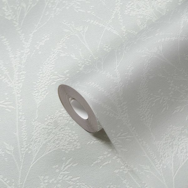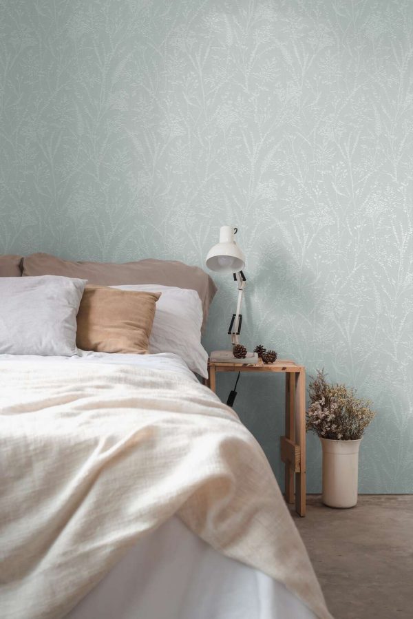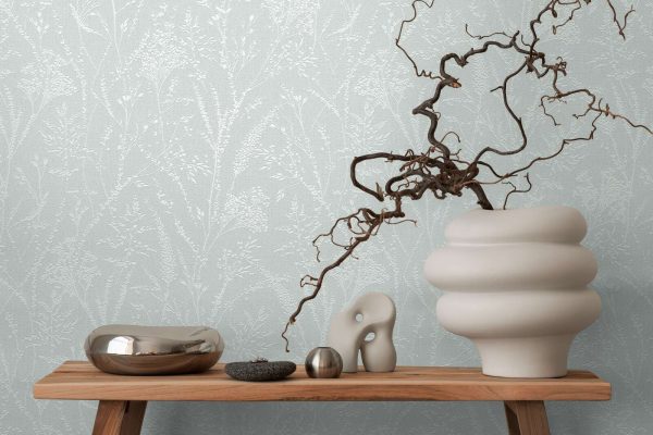 Medidas: 10,05 m x 0,53 m. Case: 64 / 32 cm (offset match/ case salteado). Calidad: tejido no tejido. Estilo: Papel pintado diseño de ramilletes/ zarcillos en color verde claro ligeramente metalizado.