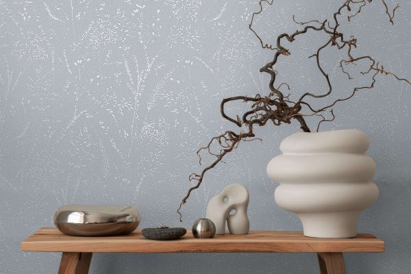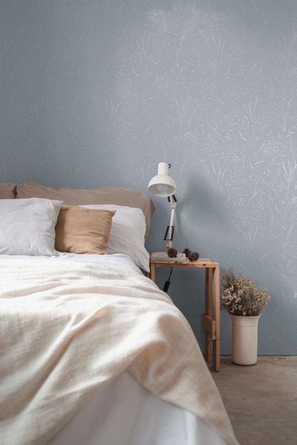 Medidas: 10,05 m x 0,53 m. Case: 64 / 32 cm (offset match/ case salteado). Calidad: tejido no tejido. Estilo: Papel pintado diseño de ramilletes/ zarcillos en color azul/gris ligeramente metalizado.
