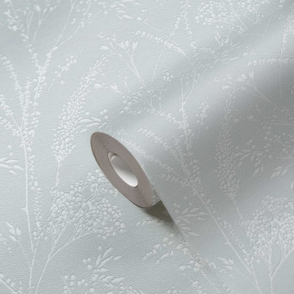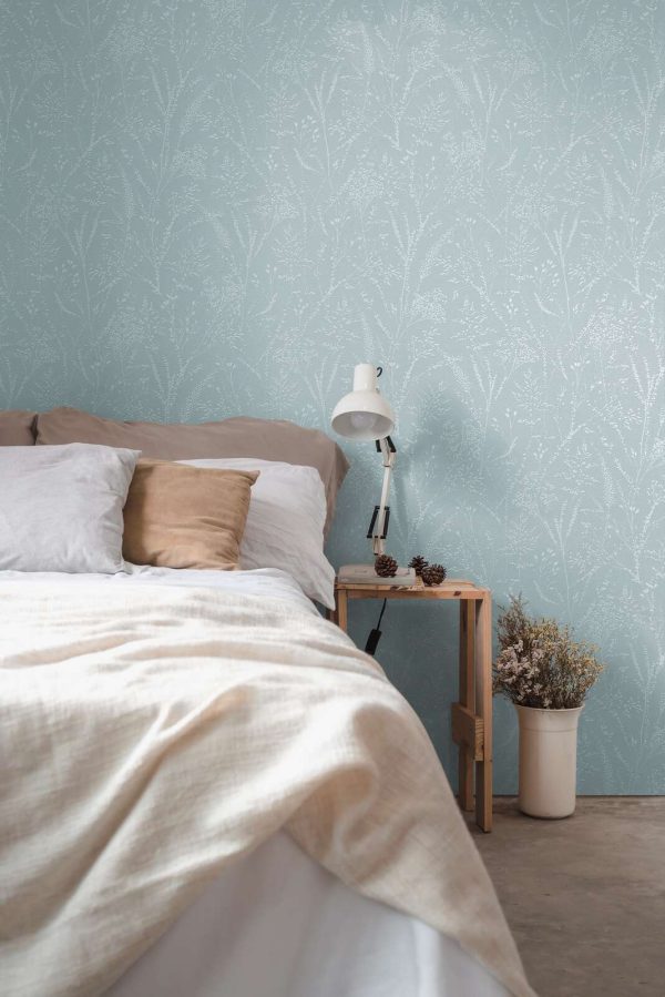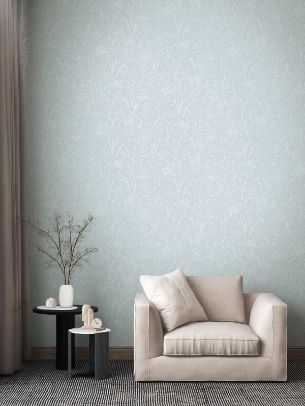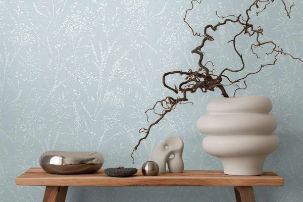 Medidas: 10,05 m x 0,53 m. Case: 64 / 32 cm (offset match/ case salteado). Calidad: tejido no tejido. Estilo: Papel pintado diseño de ramilletes/ zarcillos en color verde aguamarina ligeramente metalizado.