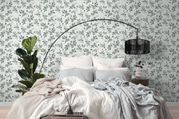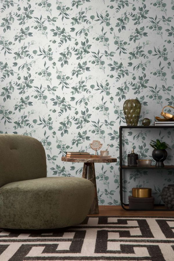Medidas: 10,05 m x 0,53 m. Case: 64/32 cm (offset match/ case salteado). Calidad: tejido no tejido. Estilo: Papel pintado diseño floral estilo romántico-chic en color verde aguamarina sobre fondo blanco con ligero efecto metalizado.