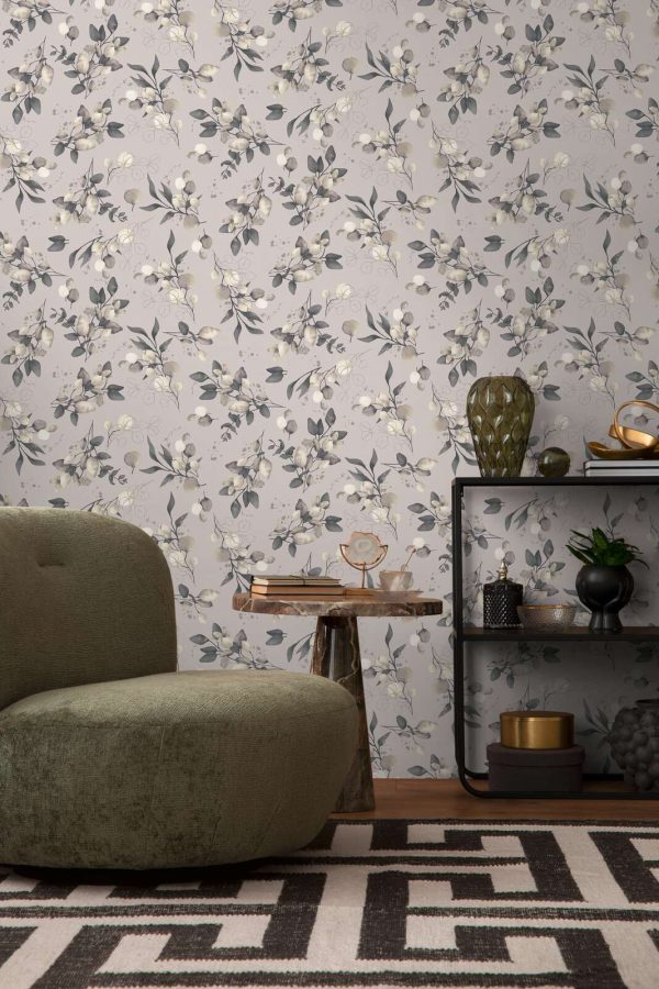 Medidas: 10,05 m x 0,53 m. Case: 64/32 cm (offset match/ case salteado). Calidad: tejido no tejido. Estilo: Papel pintado diseño floral estilo romántico-chic en color beige/gris con ligero efecto metalizado.