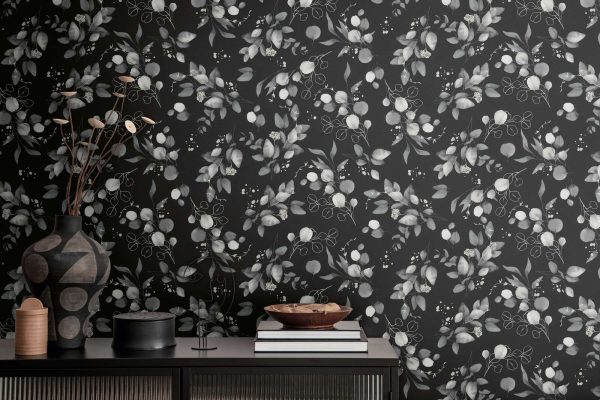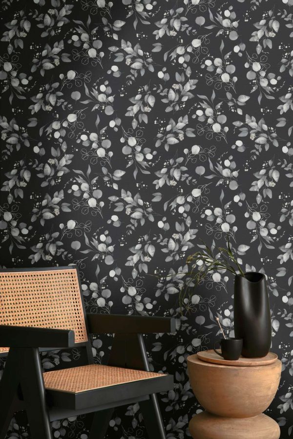 Medidas: 10,05 m x 0,53 m. Case: 64/32 cm (offset match/ case salteado). Calidad: tejido no tejido. Estilo: Papel pintado diseño floral estilo romántico-chic en color negro y gris con ligero efecto metalizado.