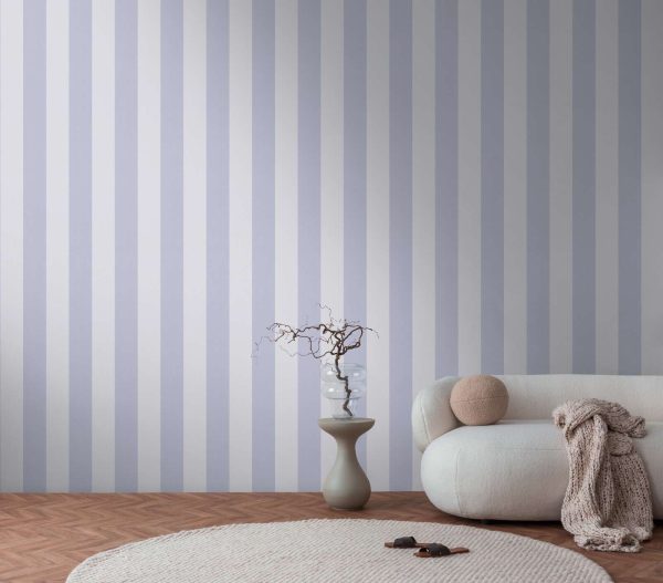 Medidas: 10,05 m x 0,53 m. Case: Sin case. Calidad: Tejido no tejido. Estilo: Papel pintado rayas de 13 cm ancho en color lila y blanco con acabado texturizado.