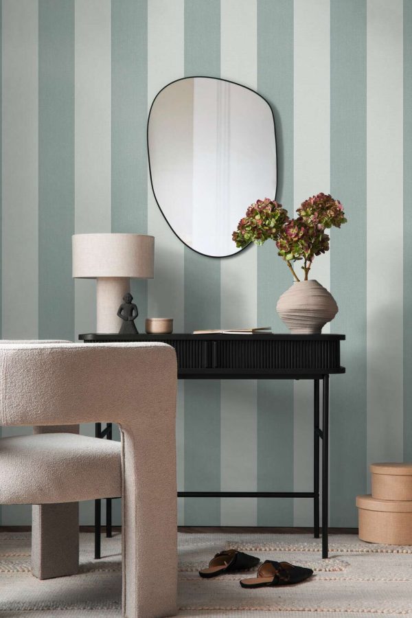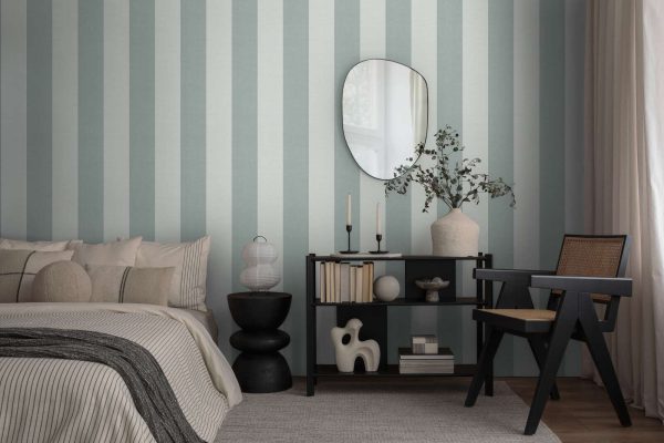 Medidas: 10,05 m x 0,53 m. Case: Sin case. Calidad: Tejido no tejido. Estilo: Papel pintado rayas de 13 cm ancho en color verde oscuro y verde claro con acabado texturizado.