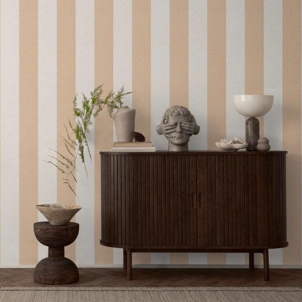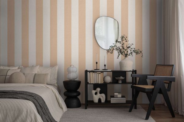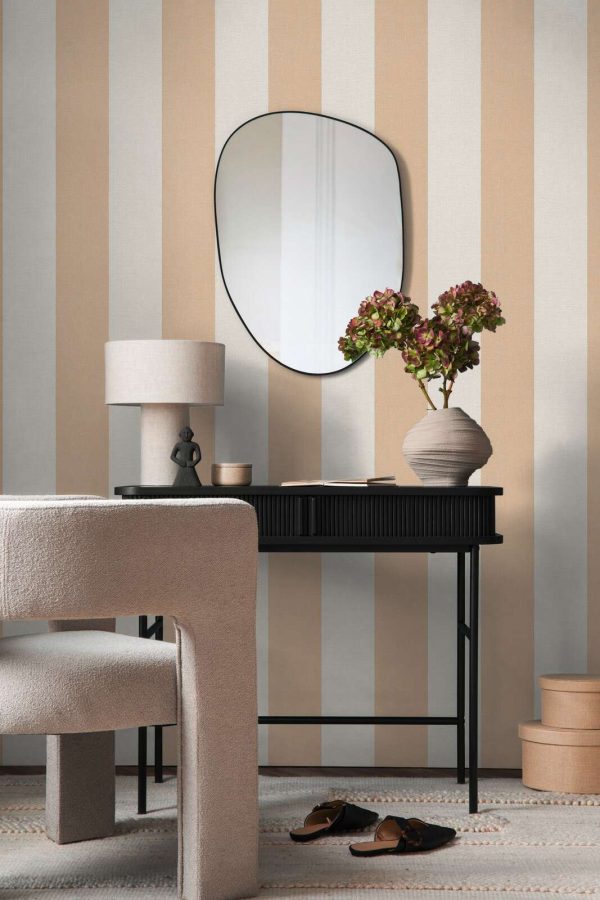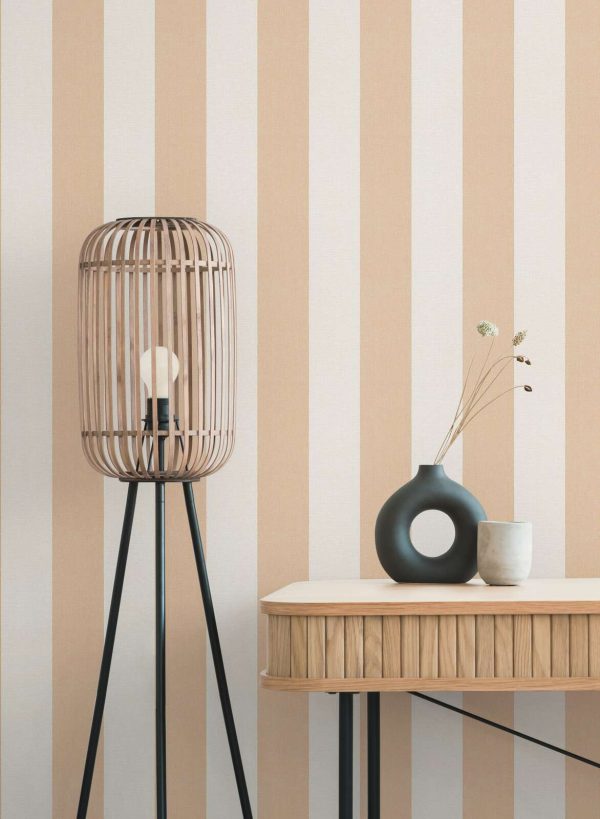 Medidas: 10,05 m x 0,53 m. Case: Sin case. Calidad: Tejido no tejido. Estilo: Papel pintado rayas de 13 cm ancho en color amarillo-ocre y beige con acabado texturizado.