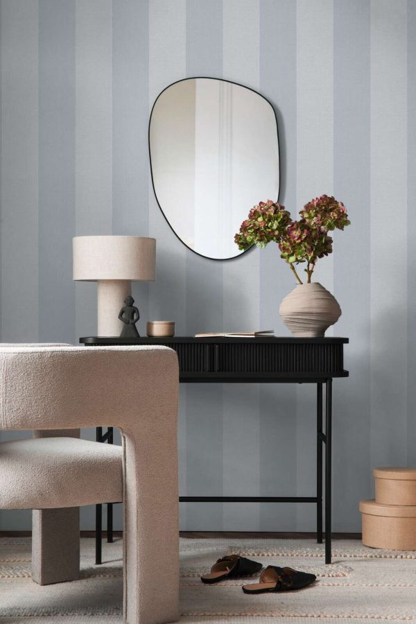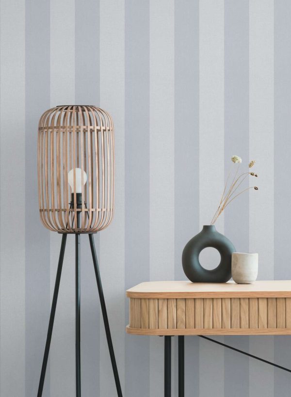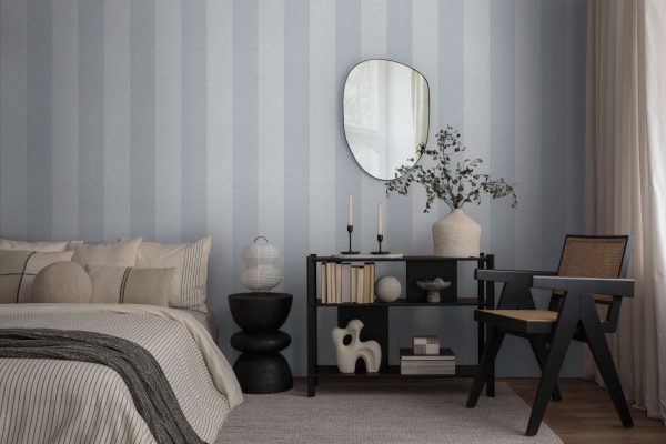 Medidas: 10,05 m x 0,53 m. Case: Sin case. Calidad: Tejido no tejido. Estilo: Papel pintado rayas de 13 cm ancho en color azul y gris con acabado texturizado.