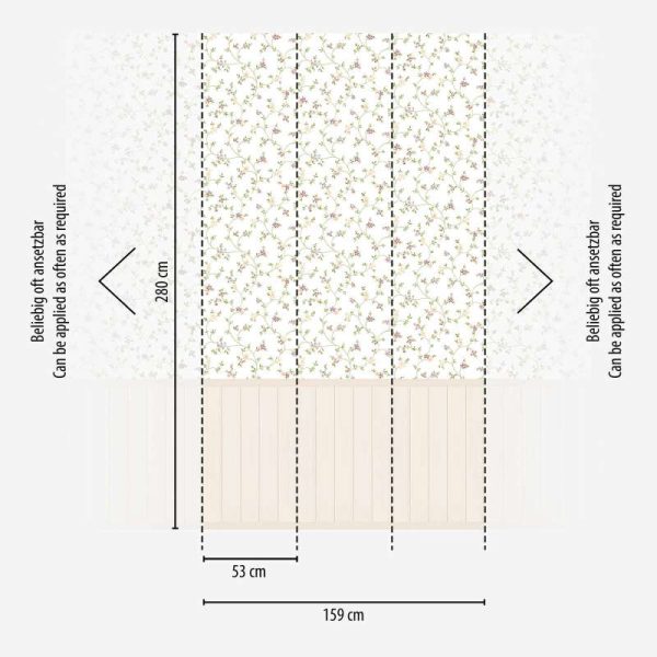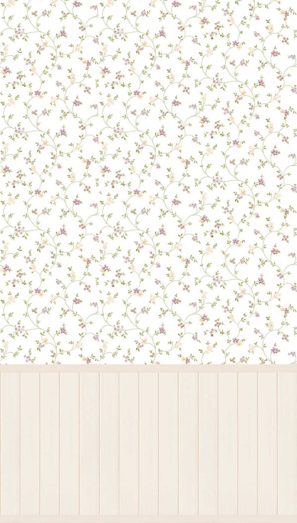 Estilo: Mural digital en paneles con cenefa-zócalo de lamas de madera blanca y motivo floral estilo campiña francesa.
