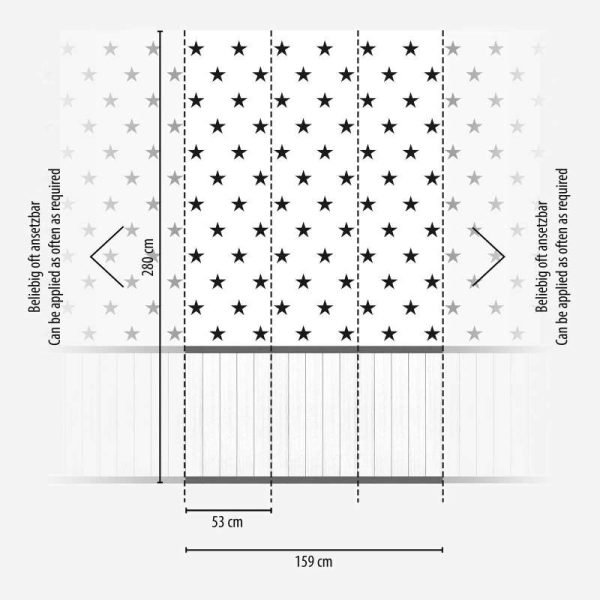 Medidas: 2,80 m x 1,59 m. Formato Rollo: 0,53 m x 8,80 m Case: Sin case. Calidad: Tejido no tejido. Estilo: Mural digital con cenefa-zócalo efecto lamas de madera blanca y estrellas negras sobre fondo blanco.