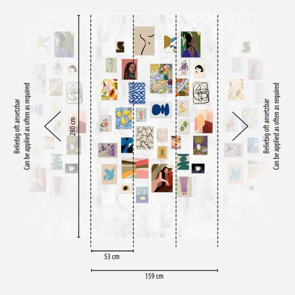 Medidas: 2,80 m x 1,59 m. (3 paneles de 0,53 m) Case: Sin case. Calidad: Tejido no tejido. Estilo: Mural de impresión digital collage con coloridas ilustraciones y creaciones artísticas. Patrón que permite repetición.