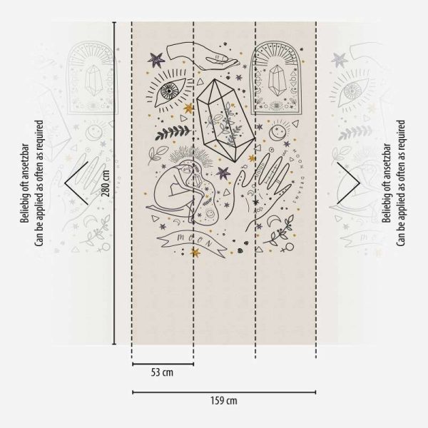 Medidas: 2,80 m x 1,59 m. (3 paneles de 0,53 m) Case: Sin case. Calidad: Tejido no tejido. Estilo: Mural de impresión digital con ilustraciones creativas y abstractas. Patrón que permite repetición.